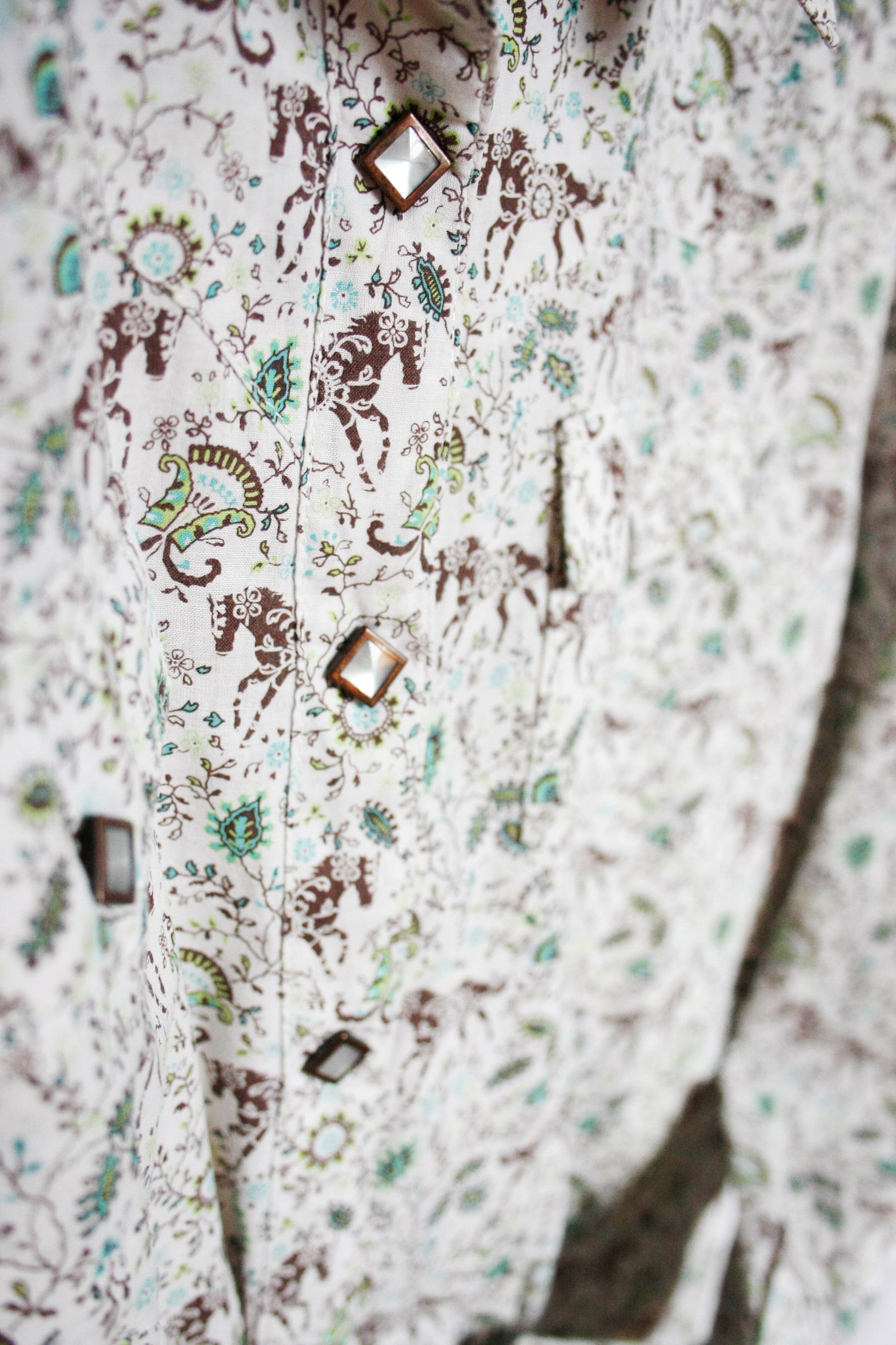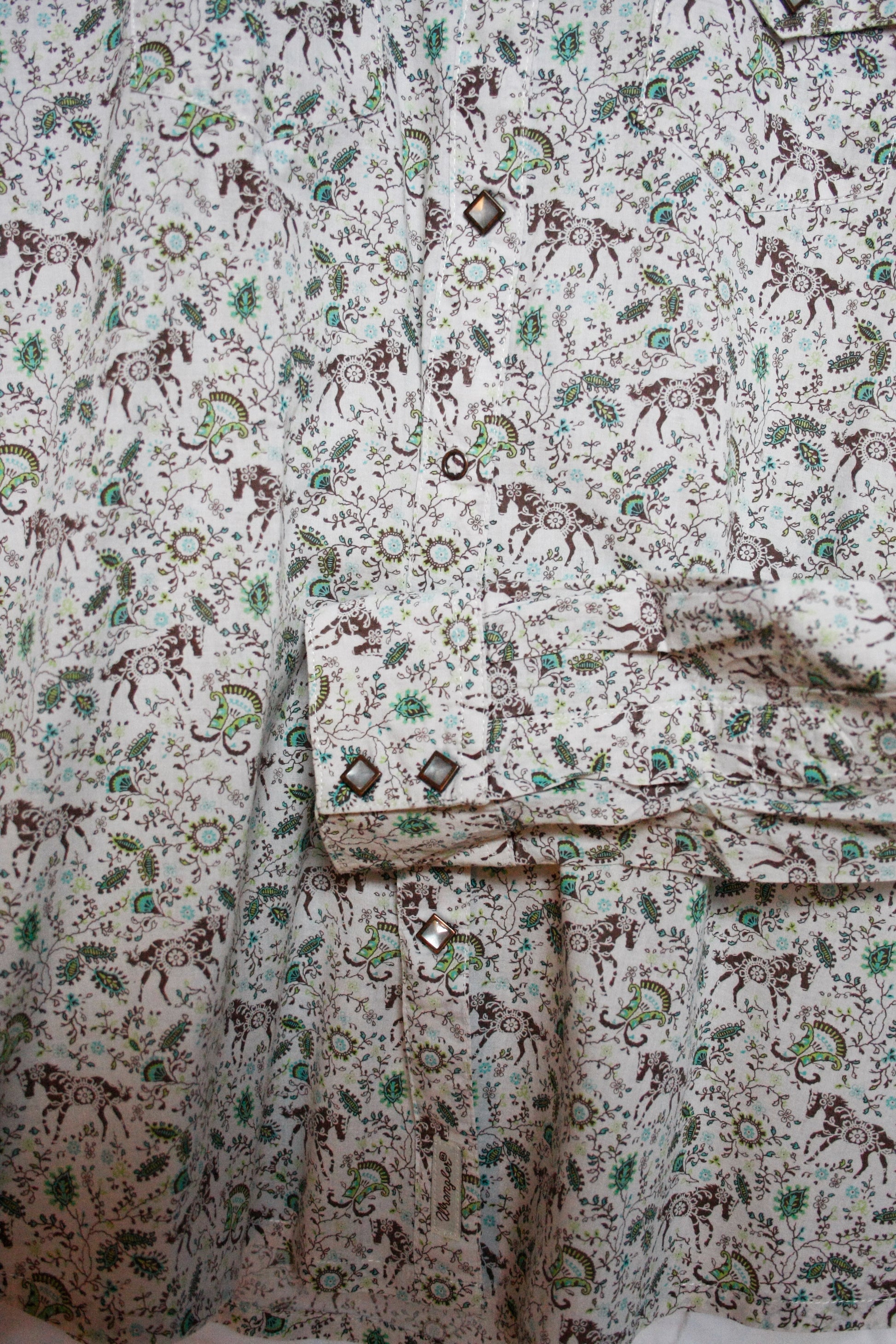Vintage Wrangler Showshirt für Ranchriding mit Pferde Muster, Pearl Snaps und tollen Details.
